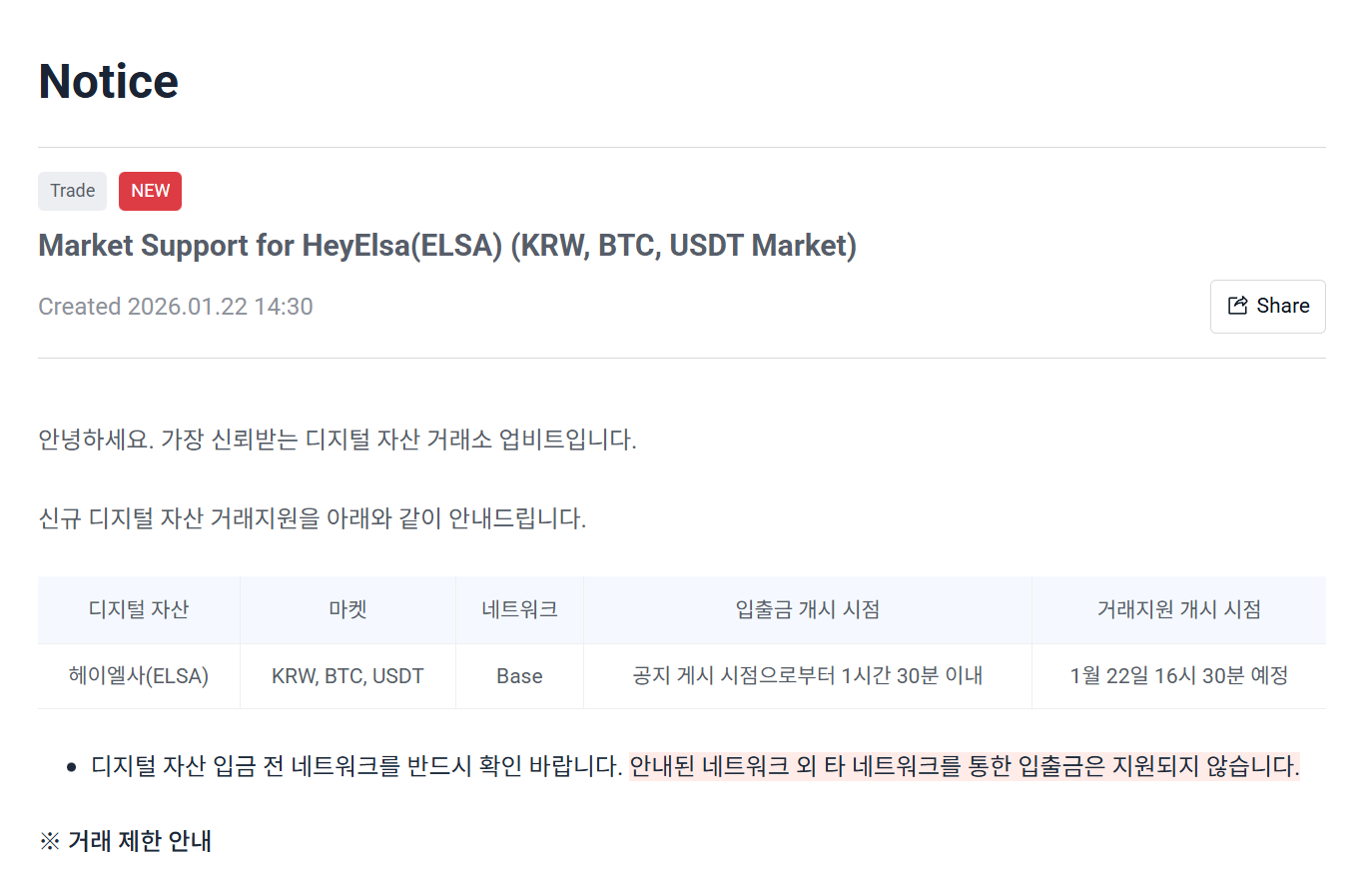 据官方公告,Upbit 将上线 ELSA 韩元、BTC 及 USDT 交易对。
