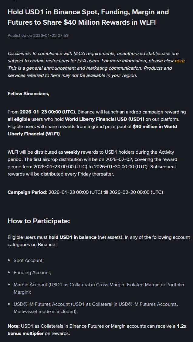 深潮 TechFlow 消息,1 月 23 日,据官方公告,自 2026 年 01 月 23 日 08:00(东八区时间)起,币安将为在平台持有 World Liberty Financial USD(USD1)的合格用户推出空投活动。符合条件的用户将瓜分 4000 万美元等值 World Liberty Financial(WLFI)总奖池。