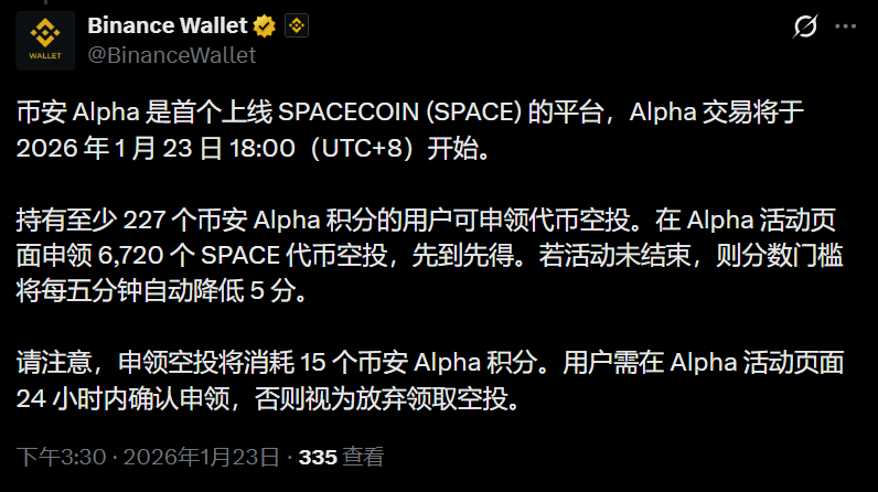 深潮 TechFlow 消息,1 月 23 日,据官方公告,币安 Alpha 是首个上线 SPACECOIN (SPACE) 的平台,Alpha 交易将于 2026 年 1 月 23 日 18:00(UTC+8)开始。