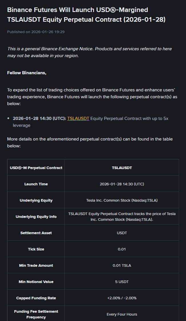 据官方公告,币安将于 2026 年 1 月 28 日 14:30 (UTC) 推出 TSLAUSDT 股票永续合约,最高杠杆 5 倍。