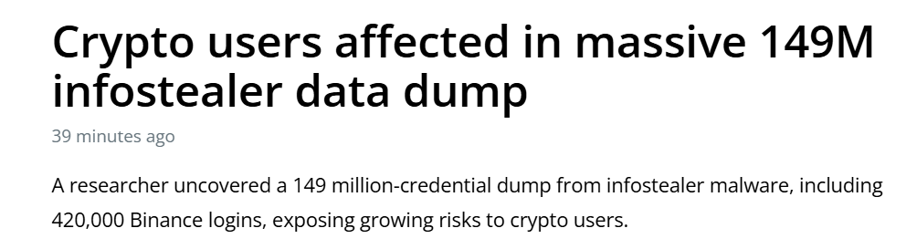 深潮 TechFlow 消息,1 月 26 日,据 Cointelegraph 报道,网络安全研究员 Jeremiah Fowler 发现了一个包含约 1.49 亿用户名和密码的公开数据库,这些数据通过信息窃取恶意软件从被感染的个人设备中收集。该数据库包含与多个主要平台相关的账户信息,其中至少有 42 万条与币安用户相关的登录凭证。