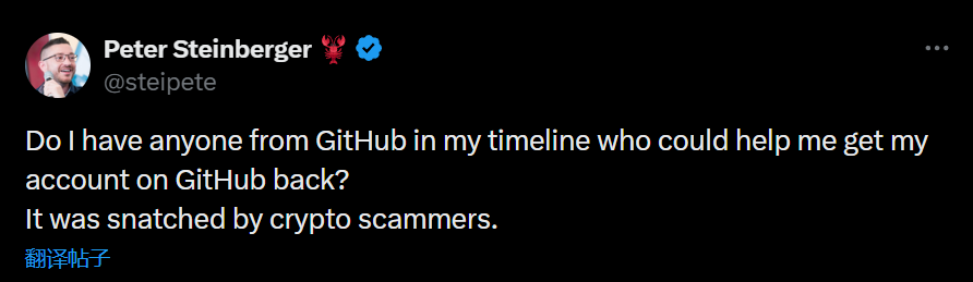 深潮 TechFlow 消息,1 月 27 日,ClawdBot 创始人 Peter Steinberger 在 社交媒体平台发文表示,“我的好友圈里有谁是GitHub的,可以帮我找回我的GitHub账号吗? 它被加密货币诈骗犯抢走了。”此前消息,其发文表示,“永远不会发行代币,任何将我列为代币所有者的项目都是诈骗。”原文链接添加收藏分享社交媒体