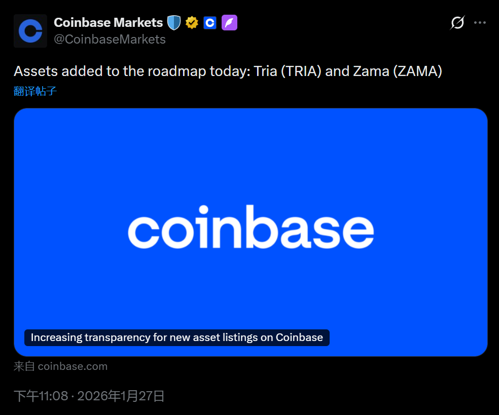 深潮 TechFlow 消息,1 月 27 日,据官方消息,Coinbase 宣布将 Tria (TRIA) 和 Zama (ZAMA)列入上币路线图,具体时间待后续公告。