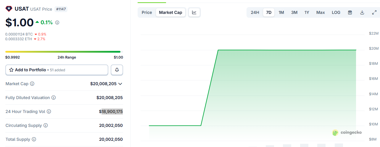 据 Coingecko 数据监测,稳定币发行商 Tether 推出受美国联邦监管的稳定币 USAT 昨日新增铸造 1000 万枚代币,当前流通供应量达 20,002,050 枚,市值约为 20,008,205 美元,24 小时交易量 18,900,175 美元。