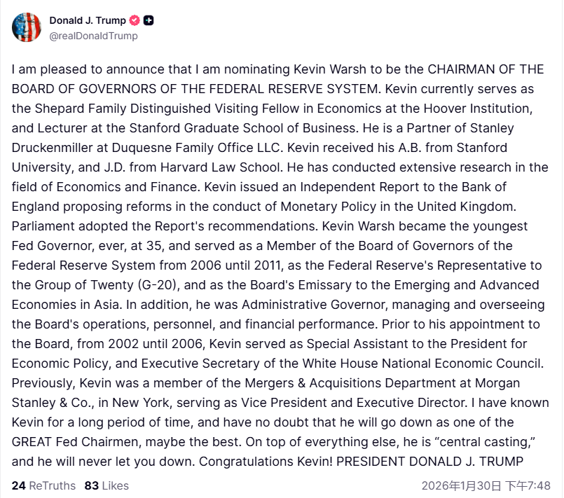 深潮 TechFlow 消息,1 月 30 日,据金十数据报道,美国总统特朗普发文称,我很荣幸地宣布,提名凯文·沃什出任美联储主席。凯文现任胡佛研究所谢泼德家族杰出客座经济学研究员及斯坦福大学商学院讲师,同时也是杜肯家族办公室与斯坦利·德鲁肯米勒的合伙人。他持有斯坦福大学文学学士学位及哈佛法学院法学博士学位,在经济学与金融领域开展了广泛研究。在加入美联储理事会前,他于2002年至2006年担任总统经济政策特别助理兼白宫国家经济委员会执行秘书。此前,他在纽约摩根士丹利并购部门担任副总裁兼执行董事。我与凯文相识很长时间,坚信他将成为史上最杰出的美联储主席之一,或许是最出色的一位。他不仅具备一切所需资质,更拥有领袖气质,绝不会令大家失望。祝贺凯文。