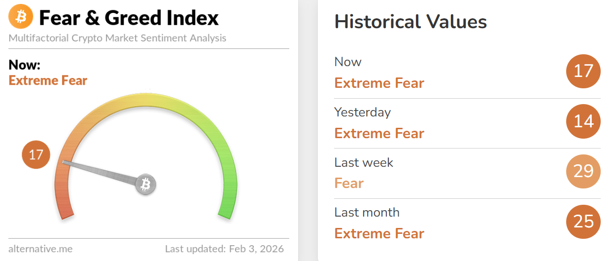 深潮 TechFlow 消息,2 月 3 日,据 Alternative.me 数据,今日加密货币恐慌与贪婪指数升至 17(昨日该指数为 14),表明市场仍处于「极度恐慌状态」。