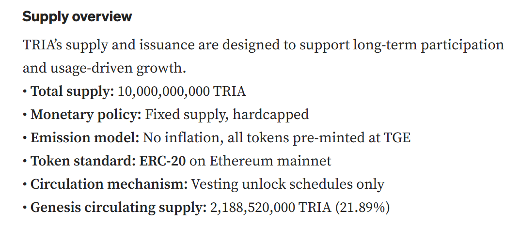 深潮 TechFlow 消息,2 月 3 日,据官方消息,自托管数字银行 Tria 公布 TRIA 代币经济学模型,总供应量为 100 亿枚,采用固定供应、硬顶模式,无通胀设计。