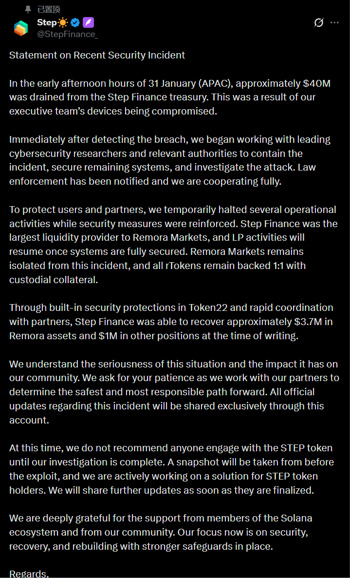深潮 TechFlow 消息,2 月 3 日,据 Step Finance 官方发文确认,该项目于 1 月 31 日遭遇的安全事件中,约 4000 万美元资金从其国库中被盗,原因是执行团队设备被入侵。目前,Step Finance 已与网络安全研究人员和相关部门合作调查此事,并已通知执法机构。