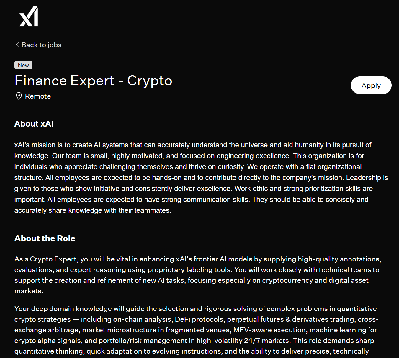 深潮 TechFlow 消息,2 月 3 日,据招聘网页显示,马斯克旗下人工智能公司 xAI 正在招聘加密金融专家,该职位完全远程办公,时薪范围为 45-100 美元。招聘要求应聘者具备量化金融、计算机科学等相关领域的硕士或博士学位,或同等专业经验。该职位将负责为 xAI 的前沿人工智能模型提供高质量的标注、评估和专家推理,重点关注加密货币和数字资产市场。应聘者需具备链上分析、去中心化金融协议、永续合约交易、跨交易所套利等领域的专业知识,以及对加密货币数据源和工具的丰富经验。xAI 表示,加密货币专家将直接参与训练和完善其高级人工智能模型,教导模型如何分析区块链数据和推理复杂的数字资产范式。