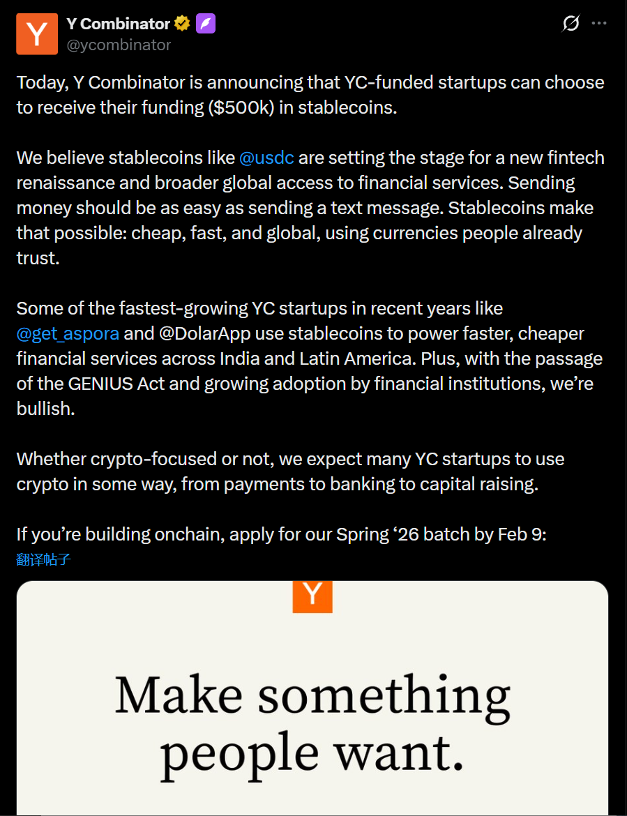 Y Combinator 预计,无论是否专注于加密货币领域,许多创业公司都将以支付、银行业务或融资等方式使用加密技术。Y Combinator 2026 年春季批次申请截止日期为 2 月 9 日。