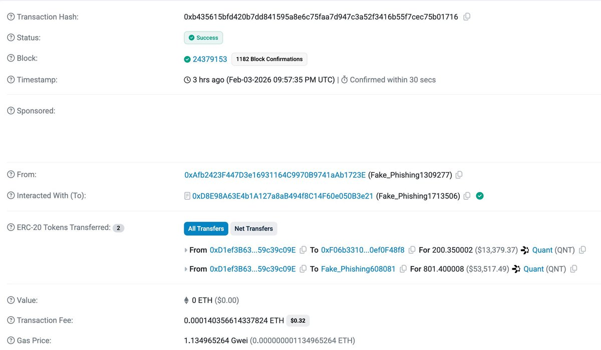 深潮 TechFlow 消息,2 月 4 日,据 GoPlus Security 监测,一个近五年未活动的钱包在签署恶意 increaseApproval 交易后遭到入侵,攻击者窃取了价值约 6.6 万美元的 QNT。