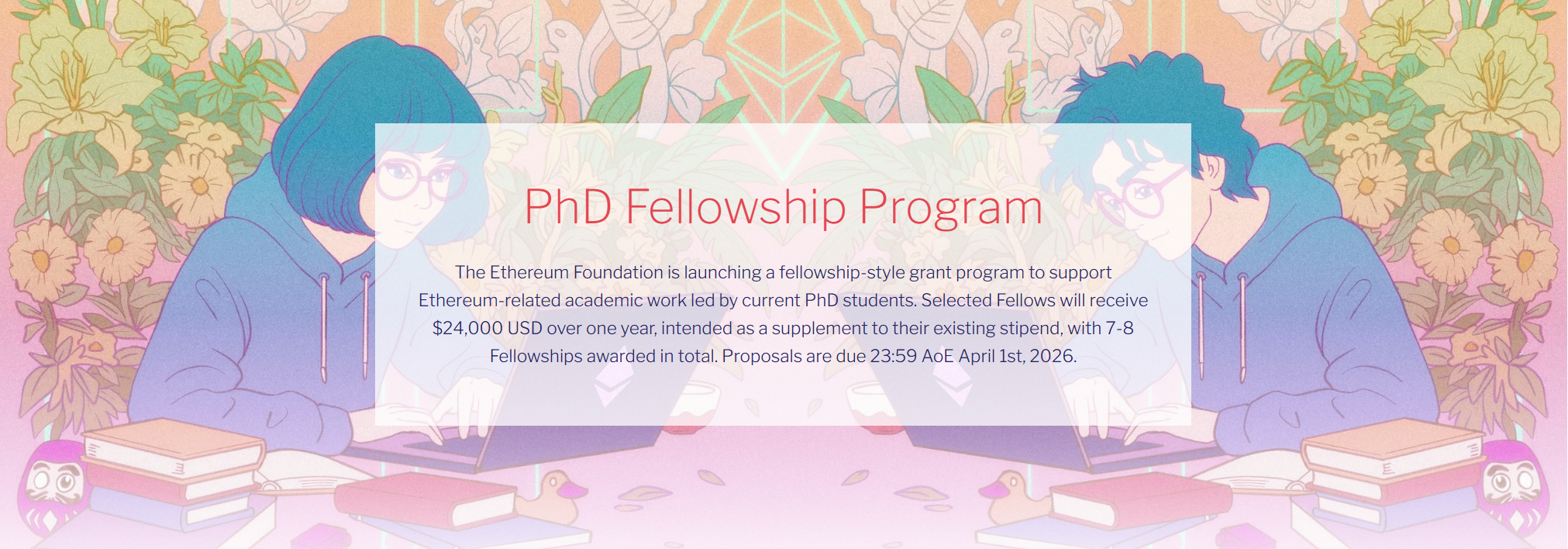 深潮 TechFlow 消息,2 月 5 日,据以太坊基金会消息,正式启动 2026 年博士奖学金计划,旨在支持由在读博士生主导的以太坊相关学术研究。该计划将向 7-8 名获选者提供每人为期一年共 2.4 万美元的资助,作为其现有奖学金的补充。申请截止日期为 2026 年 4 月 1 日。