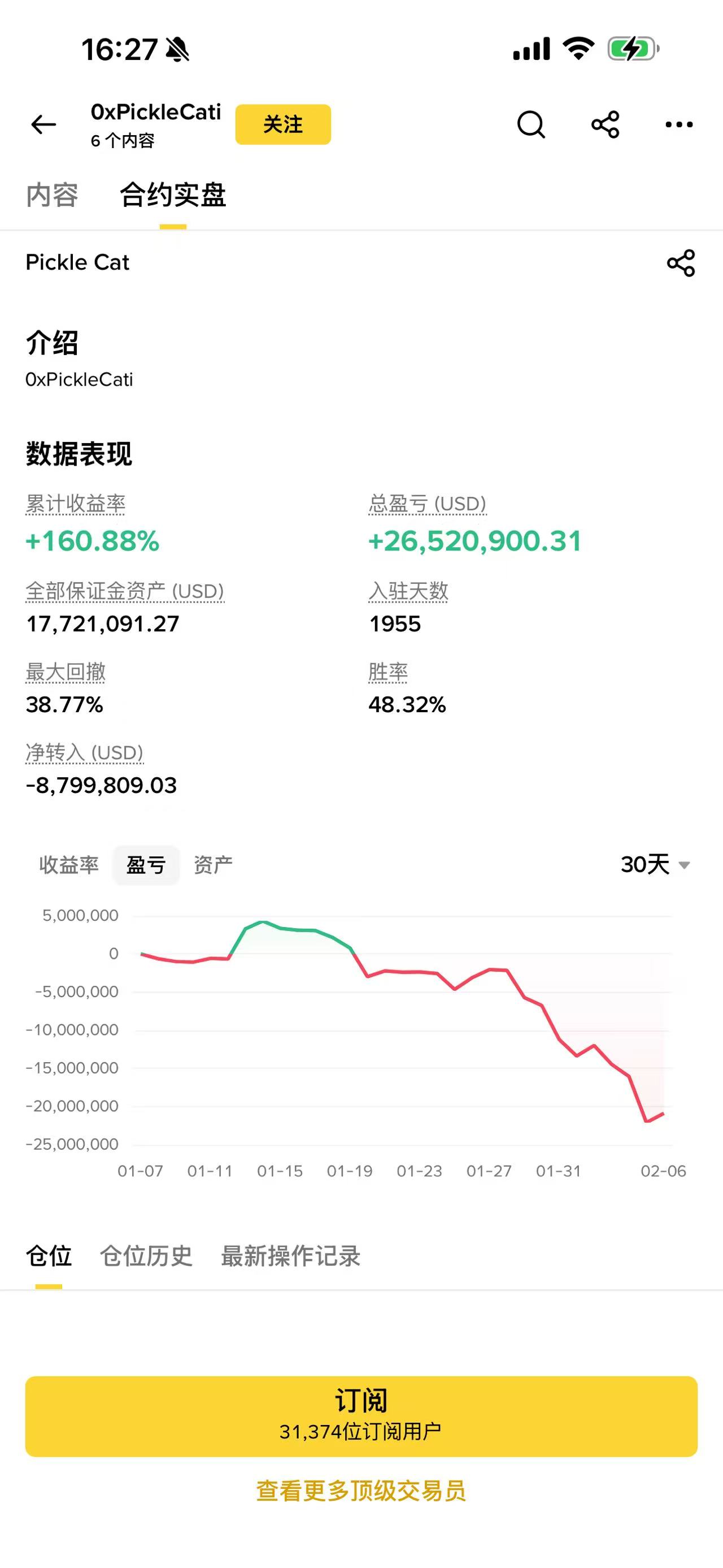 据官方页面显示,前币安合约实盘聪明钱榜首「0xPickleCati」总盈利较高点回撤超 50%(近 3000 万美元),目前总盈利仍超 2600 万美元,收益率 160.88%。