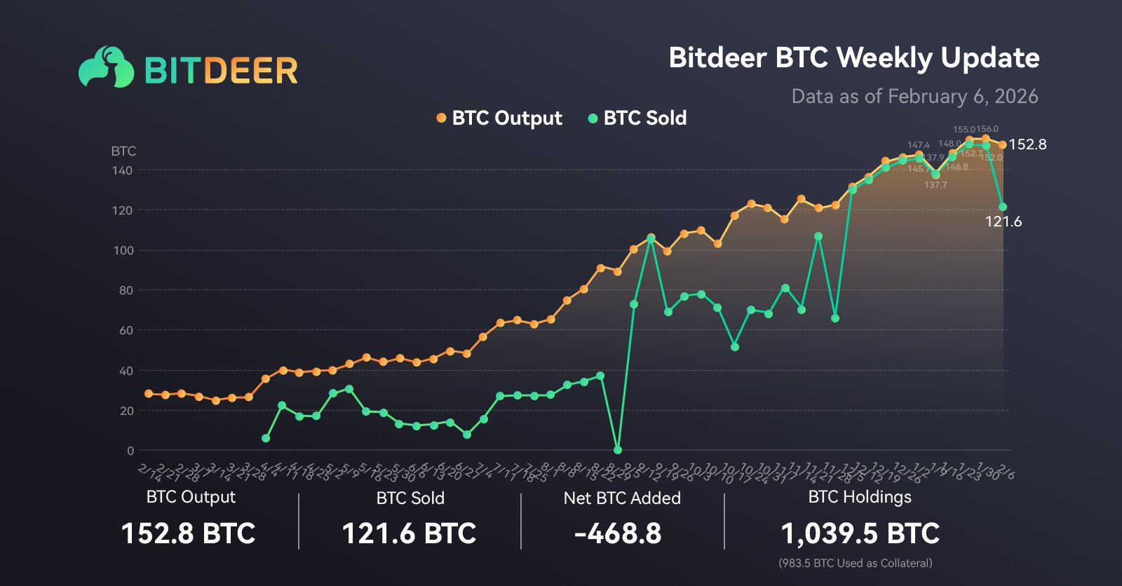 据 Bitdeer 官方披露,截至 2026 年 2 月 6 日,持有 1,039.5 枚比特币(不包括客户存款)。在过去一周,Bitdeer 产出了 152.8 枚比特币,售出 121.6 枚比特币,净减少 468.8 枚比特币。
