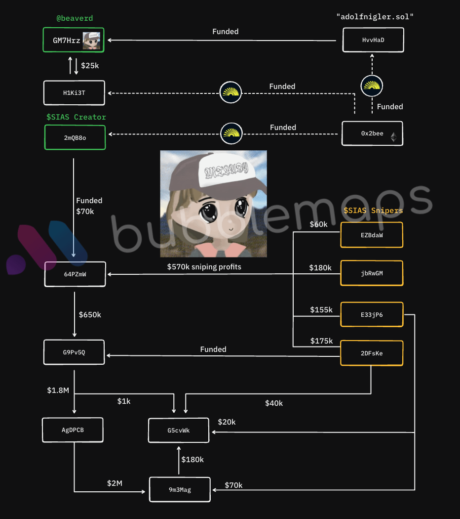 Bubblemaps 追踪该用户公开地址,发现其关联钱包地址 2mQB8o 曾在 Pumpfun 平台发行代币 $SIAS,该代币市值一度达 600 万美元后迅速归零,项目方随后删除所有社交媒体账号。数据显示,该用户通过 4 个侧链钱包参与抽水砸盘操作,从中获利约 60 万美元,其本人钱包还额外获利 2.5 万美元。Bubblemaps 表示,与该用户关联的钱包还曾发行多个最终归零的 Meme 币项目。