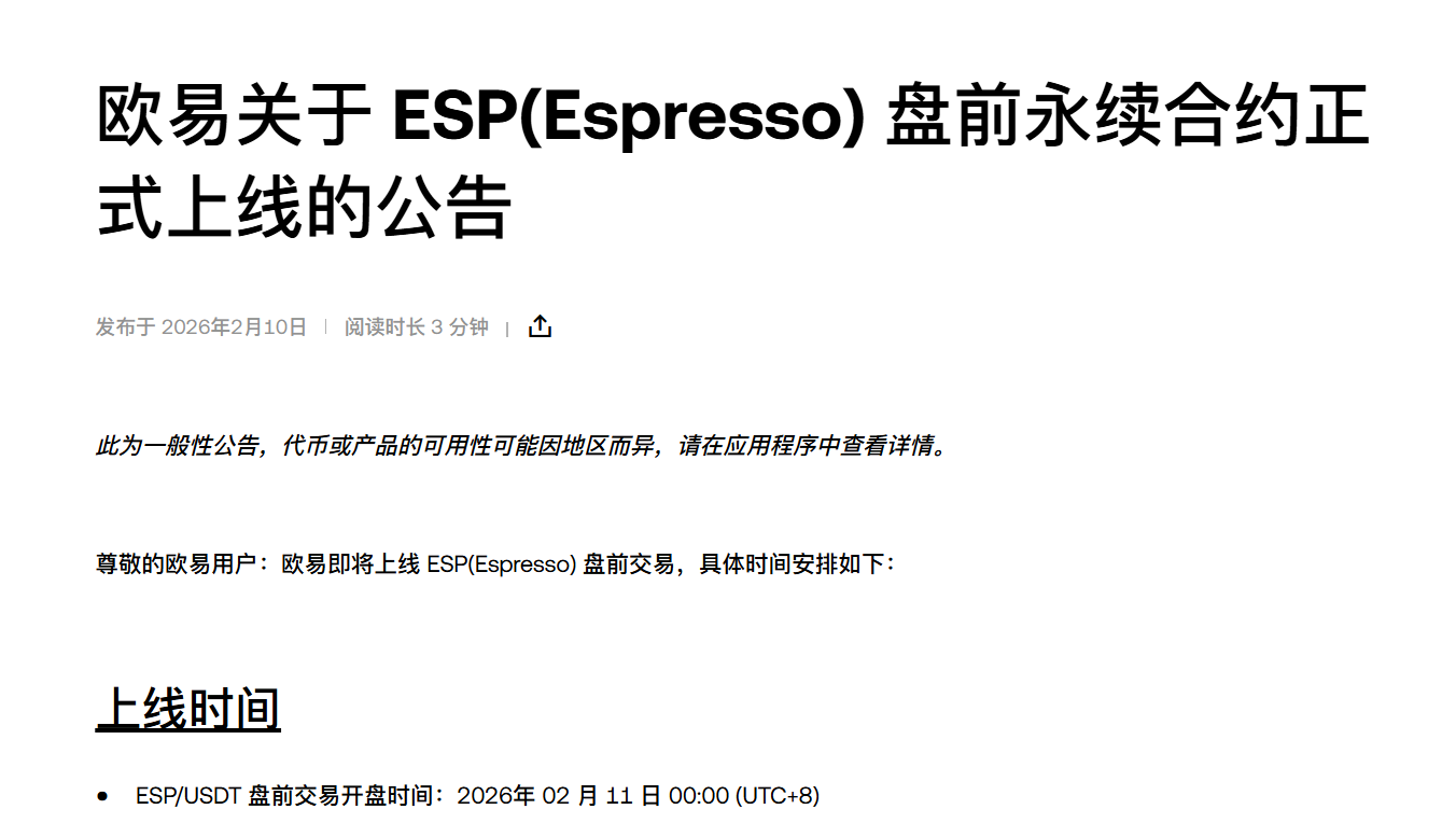 深潮 TechFlow 消息,2 月 10 日,据官方公告,OKX 即将上线 ESP(Espresso) 盘前永续合约,具体时间安排如下: