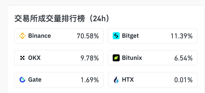中心化交易所中,流动性主要分布于币安与 Bitget,24 小时成交额分别为 12.45 亿、2.01 亿美元,位列前二。其中 Bitget 交易活跃度增速最快,单日环比涨幅超 143.79%。