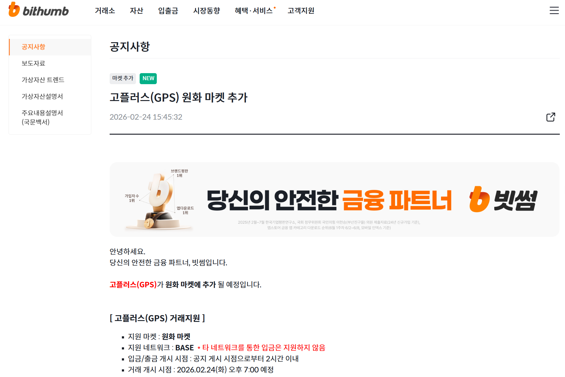 据官方公告,Bithumb 将上线 GPS 韩元交易对。