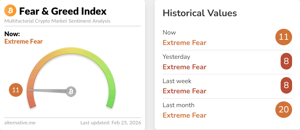 深潮 TechFlow 消息,2 月 25 日,据 Alternative.me 数据,今日加密货币恐慌与贪婪指数升至 11(昨日该指数为 8),表明市场仍处于「极度恐慌状态」。