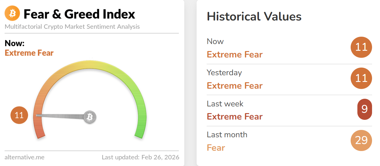 深潮 TechFlow 消息,2 月 26 日,据 Alternative.me 数据,今日加密货币恐慌与贪婪指数维持 11(昨日该指数为 11),表明市场仍处于「极度恐慌状态」。