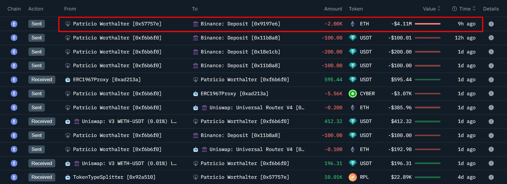 深潮 TechFlow 消息,2 月 27 日,据 Onchain Lens 监测,POAP(Proof of Attendance Protocol)创始人 Patricio Worthalter 于 9 小时前向币安交易所存入 2,000 个 ETH,价值约 411 万美元。