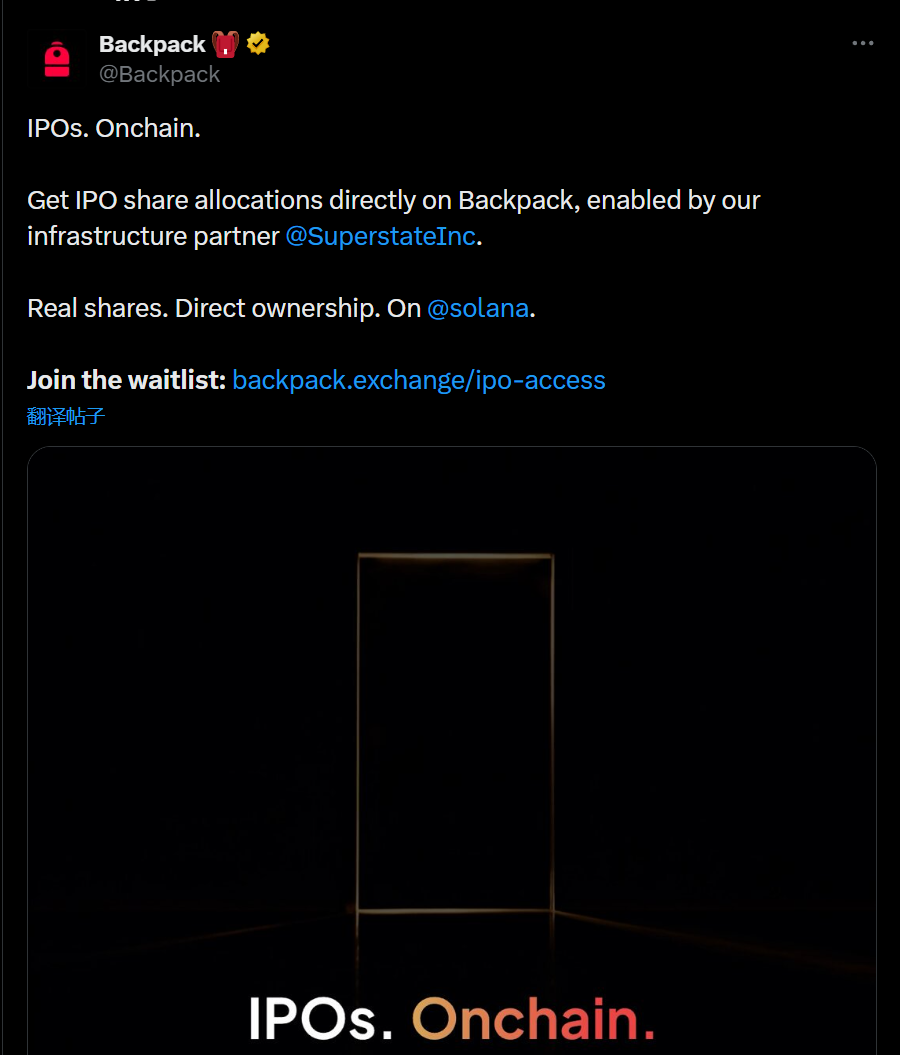 据官方公告,Backpack 宣布上线链上 IPO 新股配售功能,用户可通过平台直接获得 IPO 份额。该服务由基础设施合作伙伴 Superstate 提供支持,并基于 Solana 运行。用户将实现真实股票的直接持有。目前已开放候补名单登记。