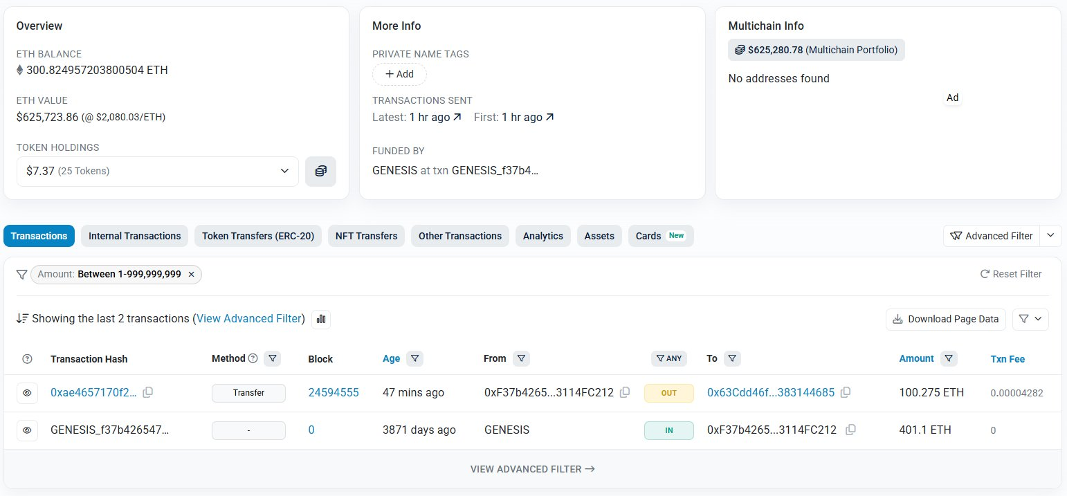 该参与者当初仅投资 125 美元购买了 401.1 枚 ETH,目前价值约 83.4 万美元,估计获得了 6,687 倍的回报。