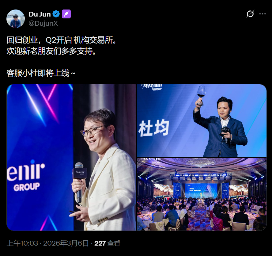 Vernal 创始人 Du Jun 在社交媒体发文表示,“回归创业,Q2开启机构交易所。”