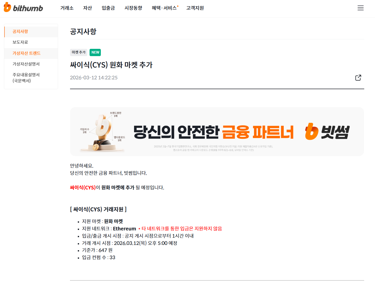 Bithumb 将上线 CYS 韩元交易对