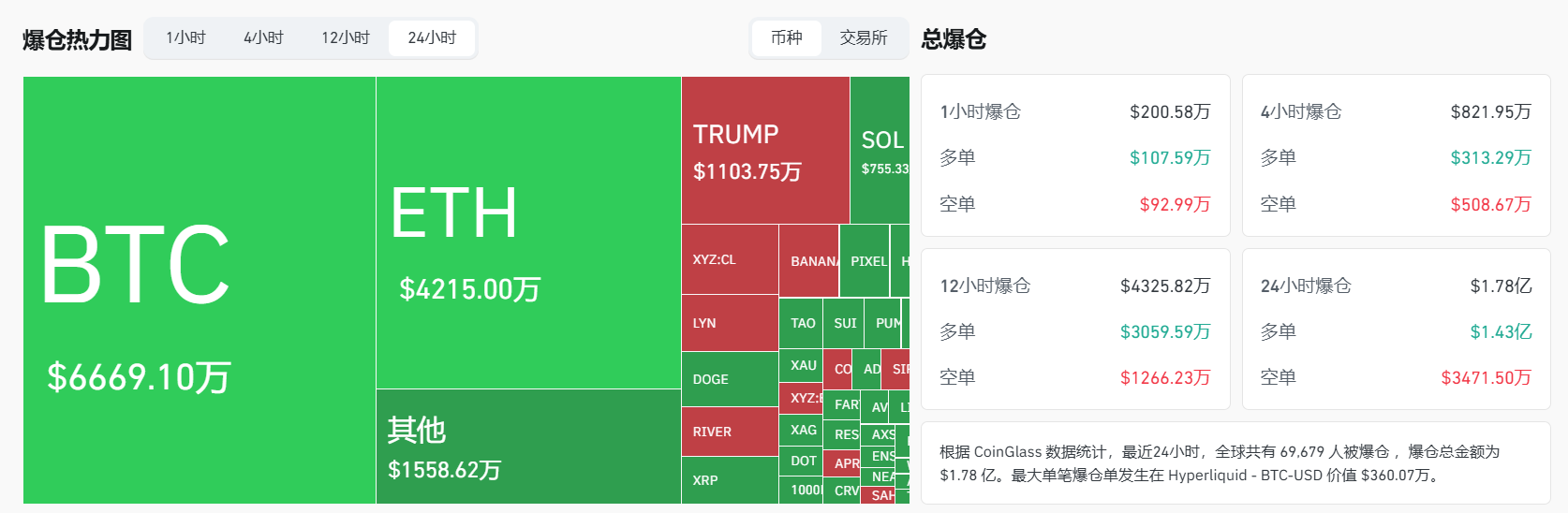 比特币(BTC)爆仓金额达 6669.10 万美元,以太坊(ETH)爆仓 4215.00 万美元。过去 24 小时内共有 69,679 人被爆仓,最大单笔爆仓出现在 Hyperliquid 的 BTC-USD 交易对上,价值 360.07 万美元。