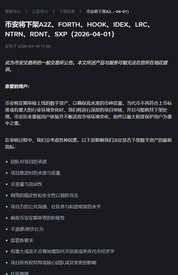 深潮 TechFlow 消息,3 月 18 日,据官方公告,币安将于2026年04月01日 11:00(东八区时间)停止交易并下架以下币种:
