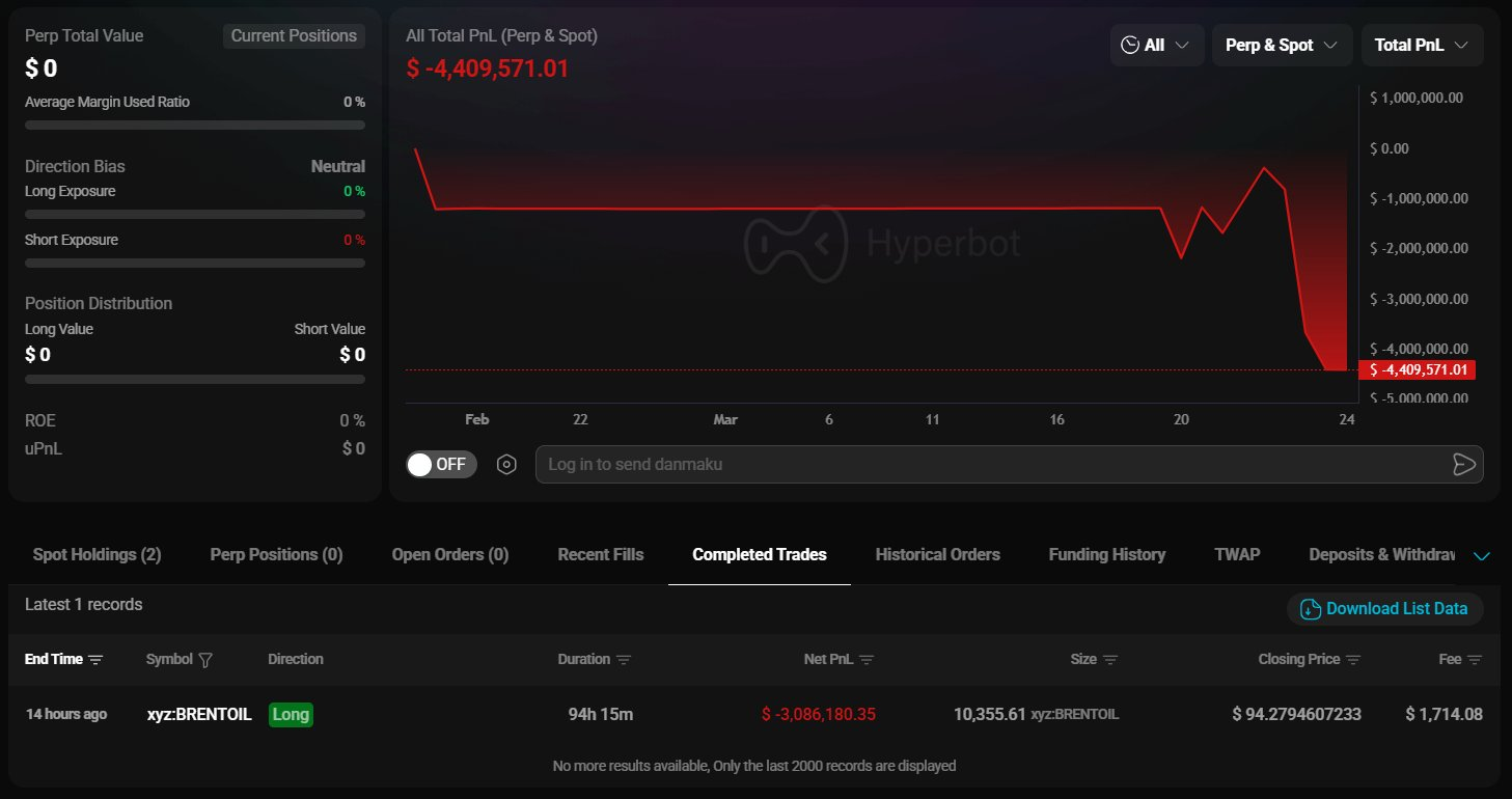深潮 TechFlow 消息,3 月 24 日,据 Onchain Lens 监测,某巨鲸此前开立的 $BRENTOIL (布伦特原油)多头仓位,因价格急速下跌触发强制平仓,本次亏损约 308 万美元。综合该地址历史交易记录,其在 $BRENTOIL 上的累计亏损已超 440 万美元。