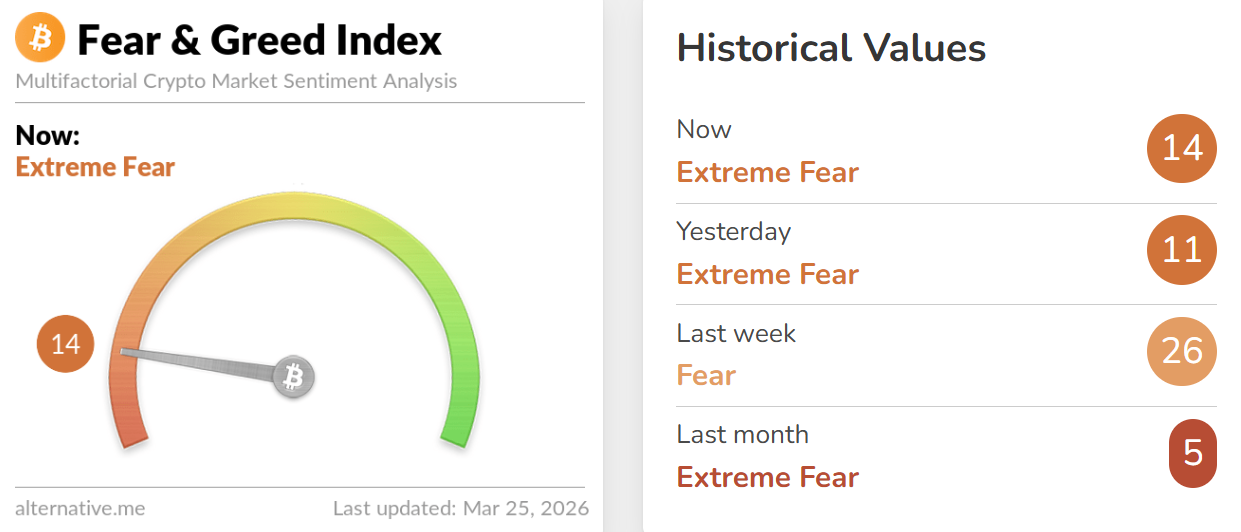 深潮 TechFlow 消息,3 月 25 日,据 Alternative.me 数据,今日加密货币恐慌与贪婪指数升至 14(昨日该指数为 11),表明市场仍处于「极度恐慌状态」。