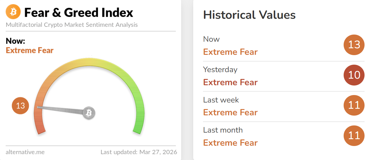 深潮 TechFlow 消息,3 月 27 日,据 Alternative.me 数据,今日加密货币恐慌与贪婪指数升至 13(昨日该指数为 10),表明市场仍处于「极度恐慌状态」。
