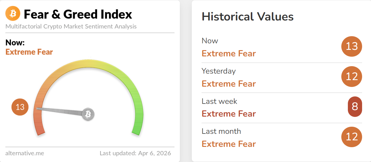 深潮 TechFlow 消息,4 月 6 日,据 Alternative.me 数据,今日加密货币恐慌与贪婪指数升至 13(昨日该指数为 12),表明市场仍处于「极度恐慌状态」。