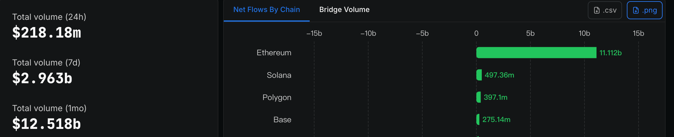 深潮 TechFlow 消息,04 月 13 日,据 DefiLlama 数据,过去 7 天内以太坊跨链桥净流入资金达 111.12 亿美元,位居所有公链之首。其次是 Solana 和 Polygon,净流入资金分别为 4.97 亿美元和 3.97 亿美元。
