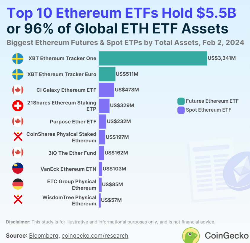前两名分别为XBT Ethereum Tracker One (COINETH)和 XBT Ethereum Tracker Euro (COINETHE),资产规模分别为33.4亿美元和5.1093 亿美元,COINETH和COINETHE都是在欧洲交易的以太坊期货ETF。