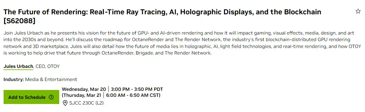 深潮 TechFlow 消息,英伟达官方信息显示,Render Network 创始人 Jules Urbach 将于 3 月 20 日下午 3:00至下午 3:50(太平洋夏令时间)在 GTC24 大会以“The Future of Rendering: Real-Time Ray Tracing, AI, Holographic Displays, and the Blockchain”(渲染的未来:实时光线追踪、人工智能、全息显示和区块链)为主题发表演讲。