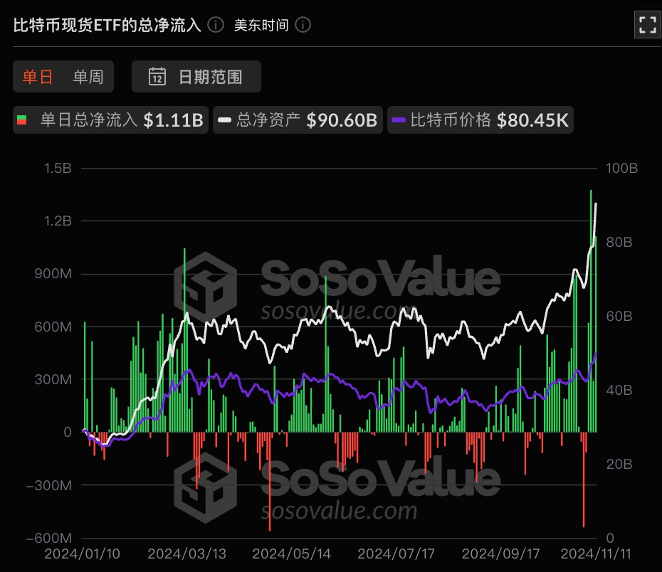 深潮 TechFlow 消息,根据 SoSoValue 数据,昨日(美东时间 11 月 12 日)比特币现货 ETF 总净流入 8.18 亿美元。