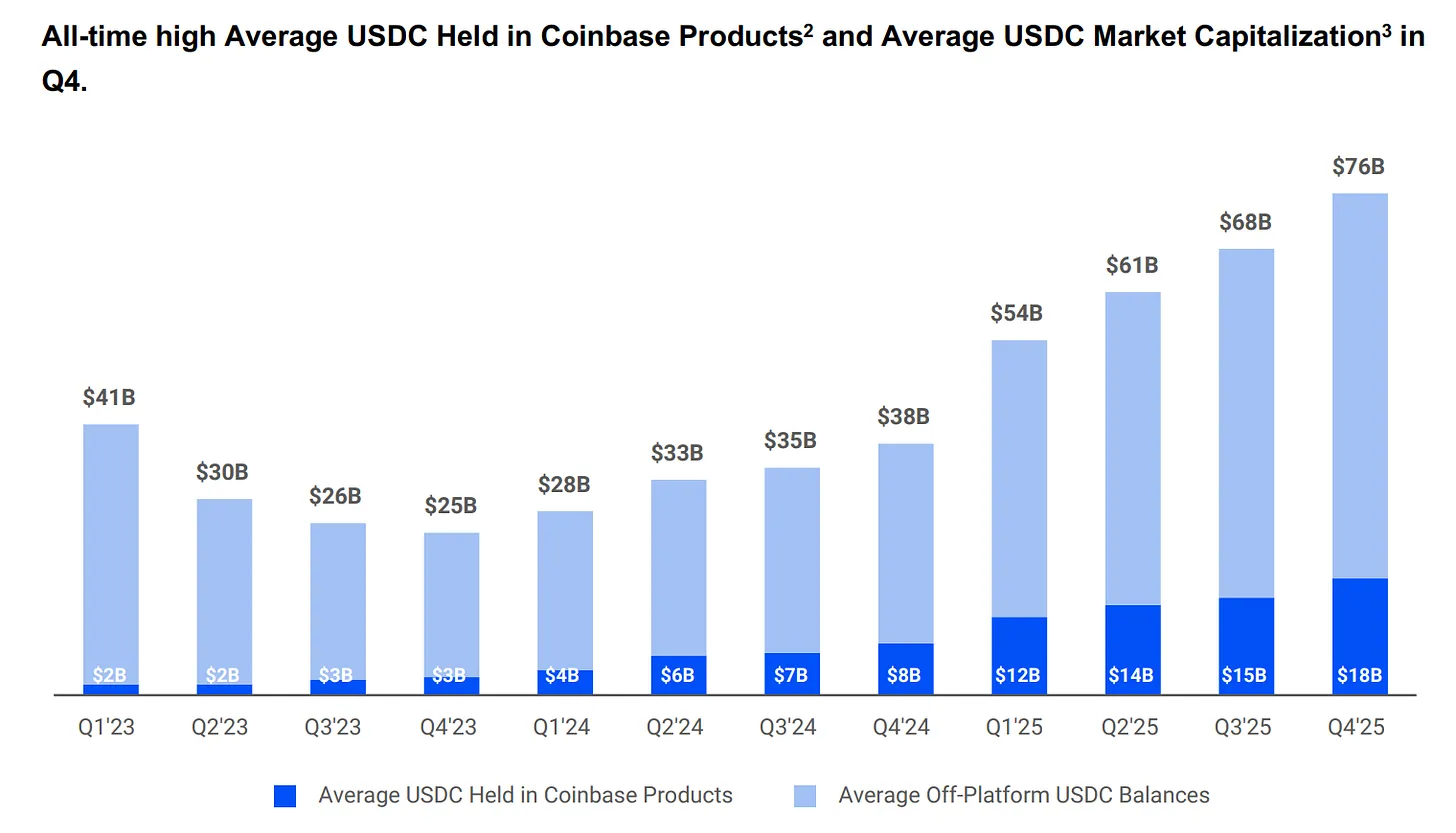 Coinbase 從其平臺上持有的 USDC 儲備收入中拿走 100%,並將其餘一切與 Circle 五五分成。在 2024 年,這一安排將 Circle 總分銷成本 10.1 億美元中的 9.08 億美元直接送給了 Coinbase。大約每賺一美元,Circle 就有 54 美分流向了一家不發行代幣也不經手儲備的公司。到 2025 年初,Coinbase 持有的 USDC 總供應量佔比達到 22%,高於 2022 年的 5%。USDC 在 Coinbase 平臺上增長越多,Circle 的收益也就越多。
