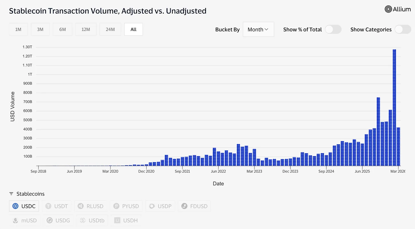 USDC 供應量近期達到 790 億美元,創下歷史新高,而整個加密貨幣市場卻較 10 月份的峰值下跌了 44%。這種背離值得我們關注。投機性資產通常會在市場下跌時下跌。USDC 持續增長的原因是人們用它來轉移資金,而不是將其作為投機工具持有。在伊朗衝突期間,中東地區對 USDC 的需求激增,正是因為傳統銀行體系變得不可靠。當正常的支付渠道中斷時,人們使用 USDC 進行匯款和跨境轉賬。這就是支付基礎設施在壓力下的表現:使用量增加,而不是減少。