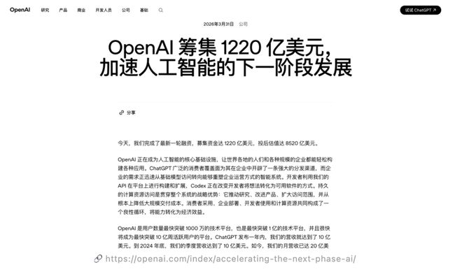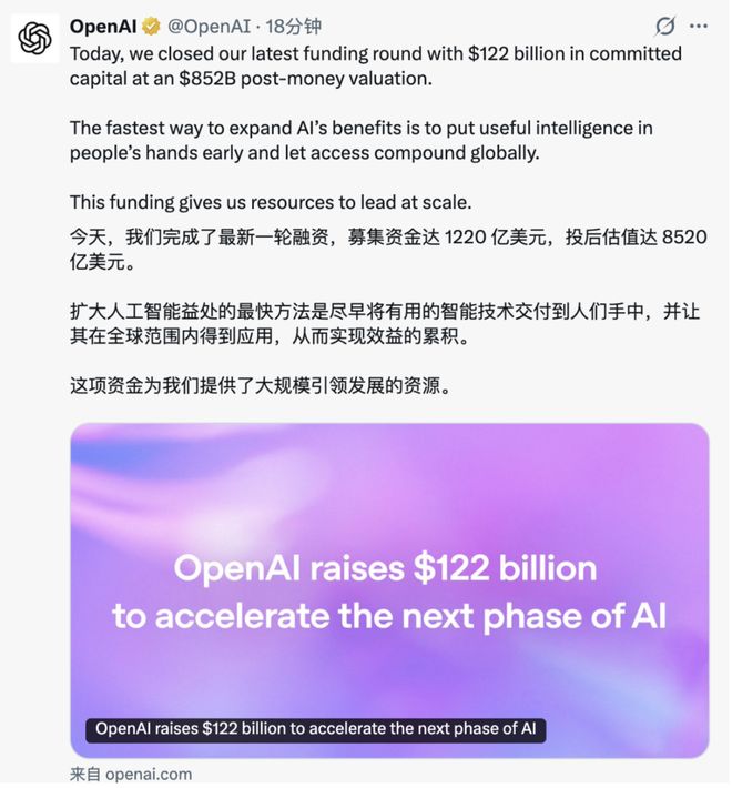 單輪私募 1220 億,人類商業史上從未有過。融資完成後,OpenAI 的估值落在 8520 億美元,距離萬億隻差一步,而這家公司成立至今才十年。