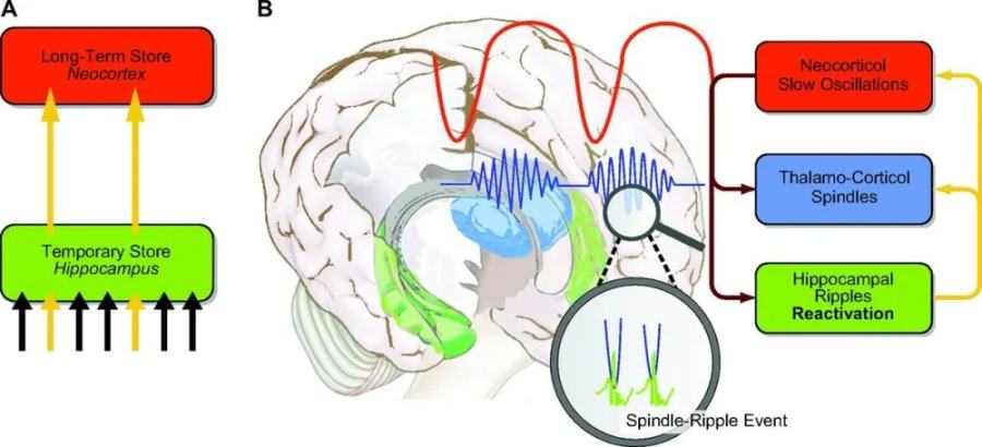 睡眠期間主動系統鞏固模型。A(數據遷移):在深度睡眠(慢波睡眠)期間,剛寫入「海馬體」(臨時存儲區)的記憶會被反覆回放,從而被逐步轉移並固化到「新皮層」(長期存儲區)中。B(傳輸協議): 這個數據轉移過程,依賴於兩個區域之間高度同步的「對話」。大腦皮層會發出緩慢的腦電波(紅線)作為主控節拍。在波峰的驅動下,海馬體將記憶碎片打包成高頻信號(綠線處的尖波漣漪),並與丘腦發出的載波(藍線處的紡錘波)完美配合。這就像是把高頻的記憶數據,精準地鑲嵌進傳輸通道的空隙裡,確保信息被同步上傳至大腦皮層。|圖片來源:National Library of Medicine(United States)