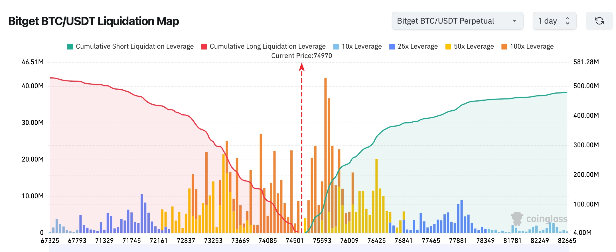 - Bitget BTC/USDT清算地圖:當前價格接近75k臨界位,上方75k–77k空單清算密集,一旦突破容易觸發連續“擠空”上漲。下方多單已基本釋放,回調缺乏清算驅動,短線結構仍偏向上。
