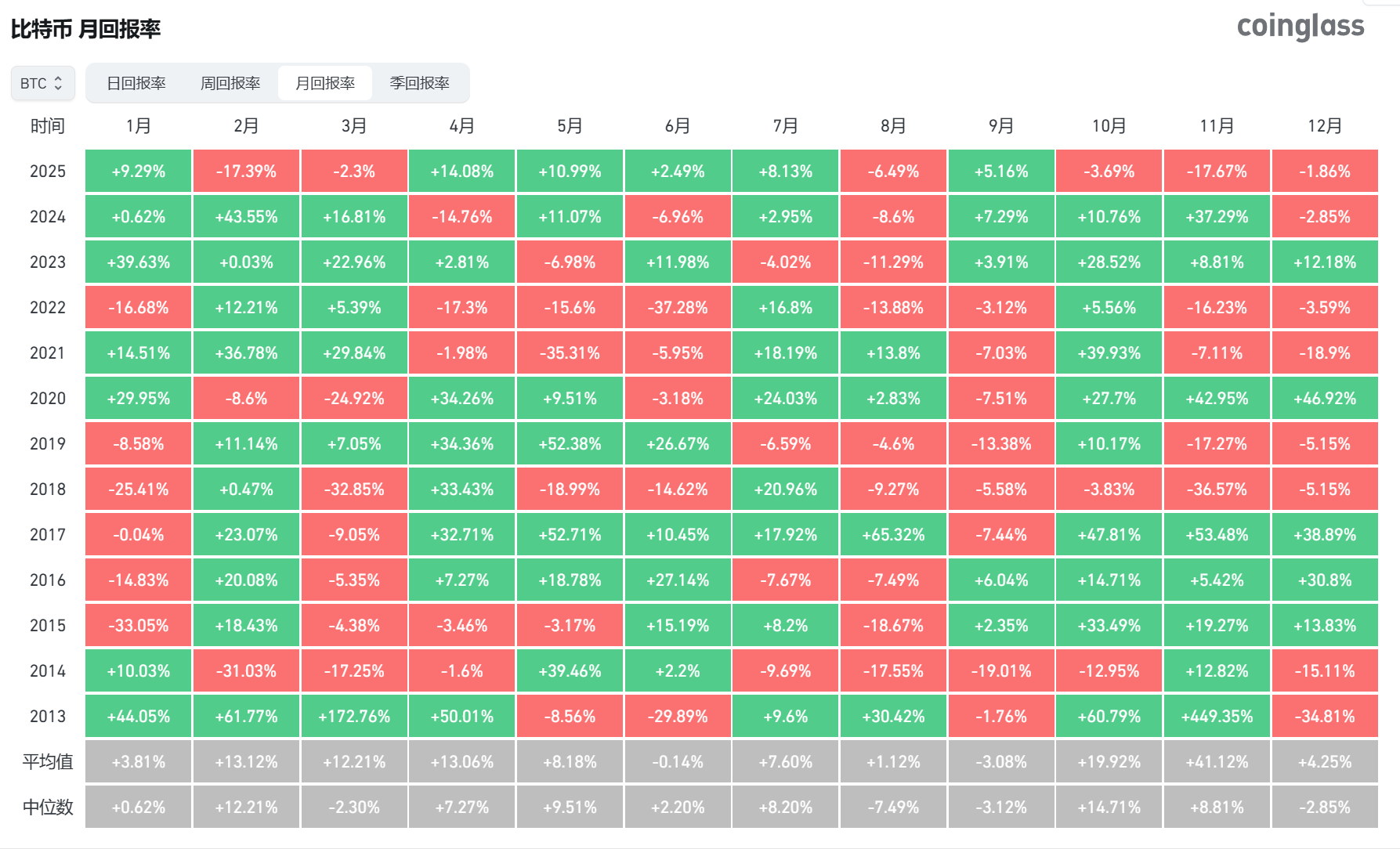 比特幣過去 13 年中有 7 個年度的 1 月回報率為正(分別是 2013 年的 +44.05%、2014 年的 +10.03%、2020 年的 +29.95%、2021 年的 +14.51%、2023 年的 +39.63%、2024 年的 +0.62%和 2025 年的 +9.29%)。