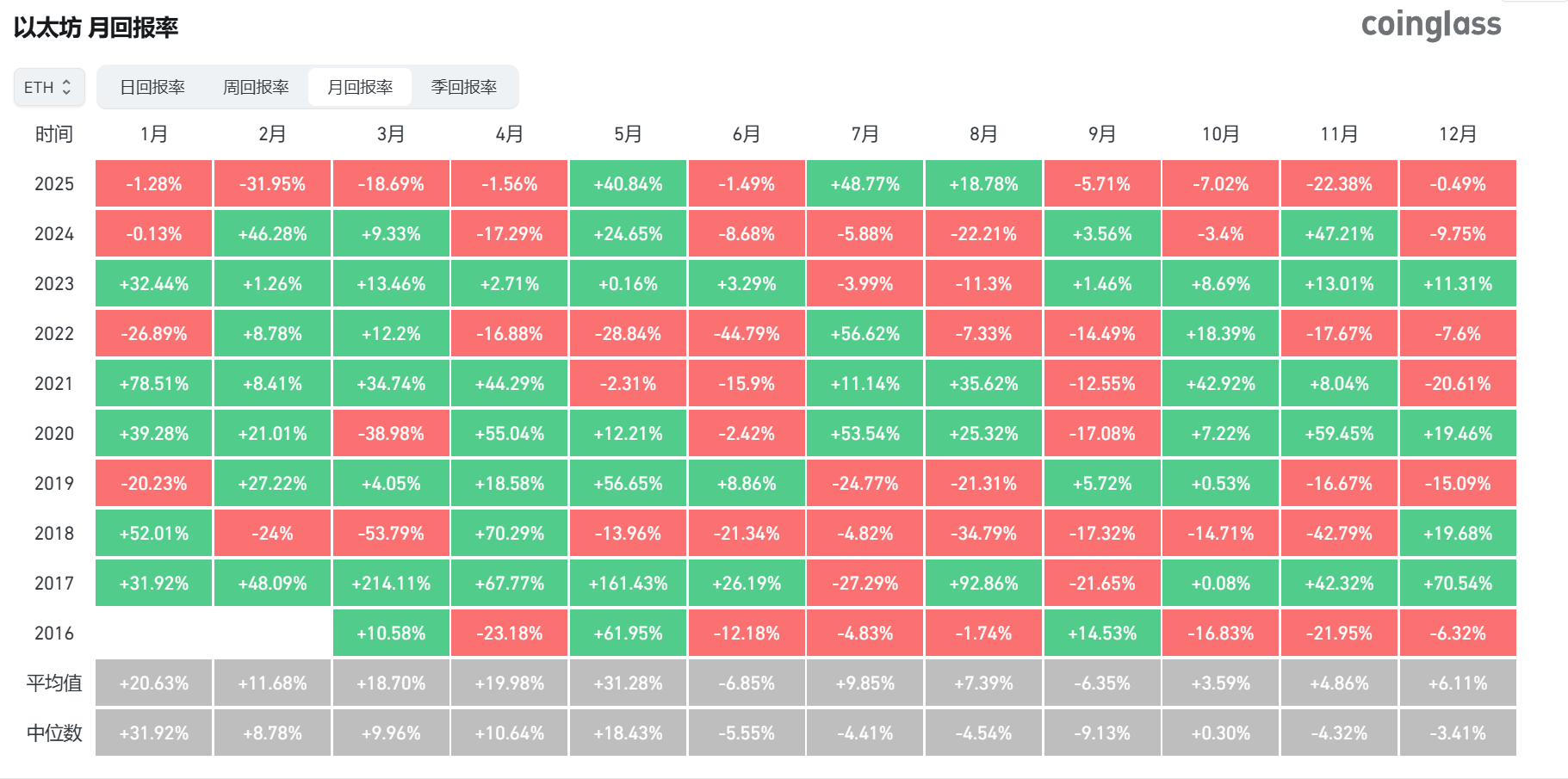 以太坊過去 9 年中有 5 個年度的 1 月回報率為正(分別是 2017 年的 +31.92%、2018 年的 +52.01%、2020 年的 +39.28%、2021 年的 +78.51%、2023 年的 +32.44%)。