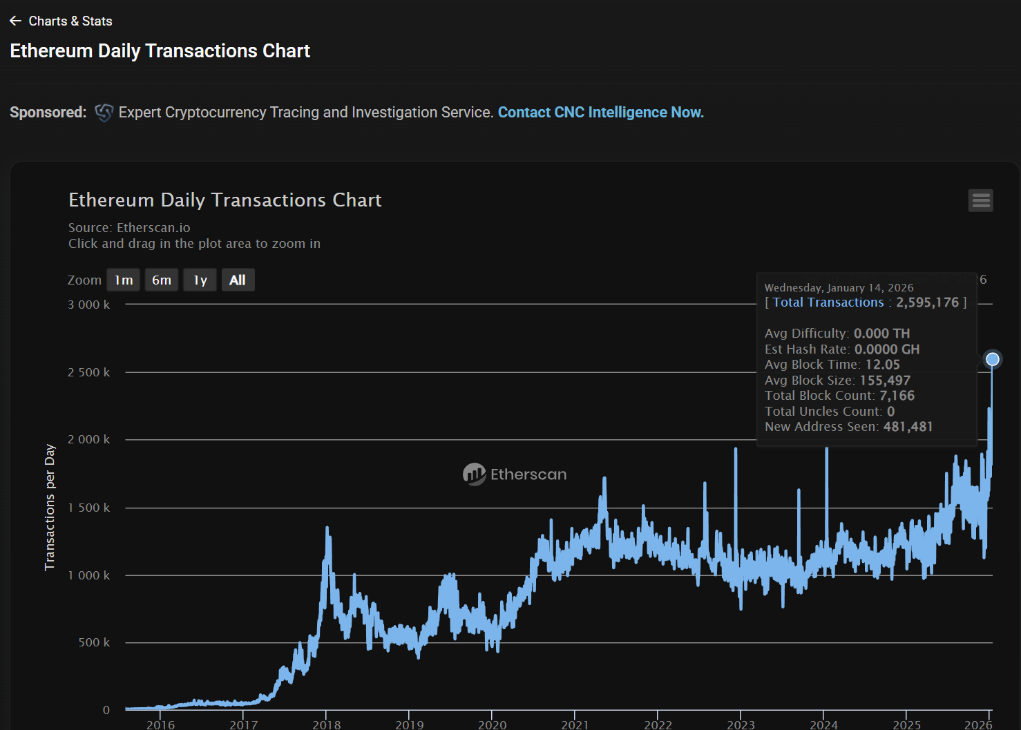 深潮 TechFlow 消息,1 月 15 日,據 Etherscan 數據,1 月 14 日,以太坊網絡日交易量逼近 260 萬筆,創下歷史新高。