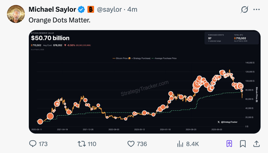 深潮 TechFlow 消息,02 月 08 日,Strategy 創始人兼執行主席 Michael Saylor 在 X 平臺再次發佈比特幣 Tracker 相關信息並寫道“Orange Dots Matter.”。