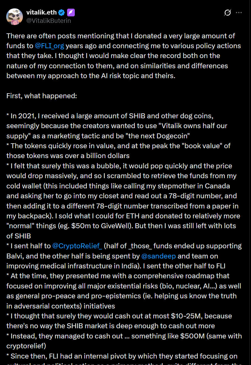 深潮 TechFlow 消息,3 月 13 日,以太坊聯合創始人 Vitalik Buterin 發文就其與未來生命研究所(Future of Life Institute)的關係及 AI 風險議題立場作出公開說明。Vitalik 表示,2021 年其被動收到大量 SHIB 等狗狗幣,彼時賬面價值一度超過 10 億美元。他隨即將其中一半捐予 CryptoRelief,另一半捐予 FLI,原以為後者最多套現 1000 萬至 2500 萬美元,但 FLI 實際套現約 5 億美元(CryptoRelief 也一樣)。