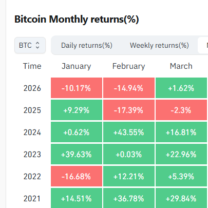 深潮 TechFlow 消息,04 月 01 日,Coinglass 數據顯示,2026年 3 月回報率收於 1.62%,未出現六個月連跌,比特幣歷史上從 2013 年起的 14 次“3 月行情”中,有 7 次收漲 7 次收跌,最大漲幅出現在 2013年 3 月,當時月漲幅達 172.76%;最大跌幅發生在 2018年 3 月,當時月跌幅達 32.85%。此外,比特幣一季度投資回報率為-22.34%,創下 2013 年至今第三大季度跌幅。